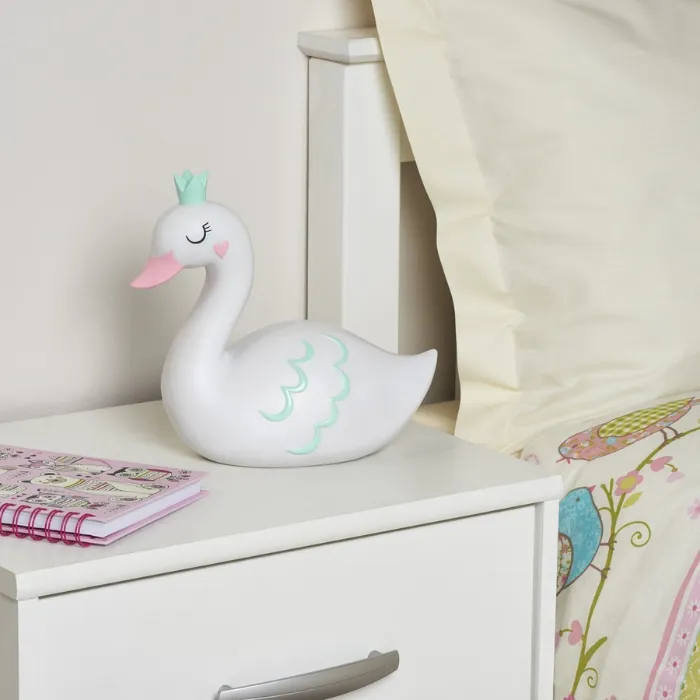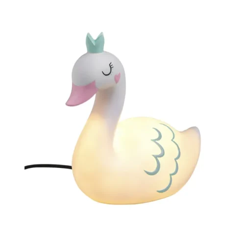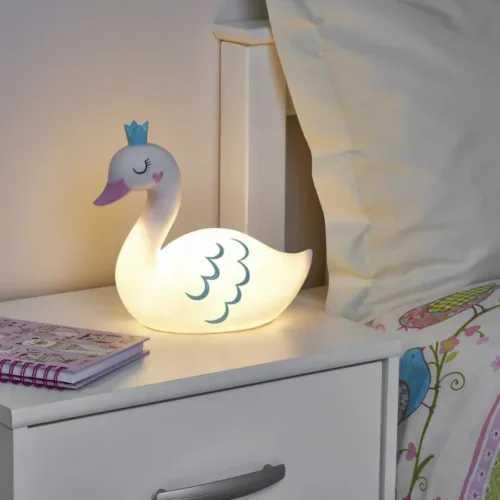 This LED table lamp features a swan shape, perfect for kids’ bedrooms. Its white resin body adds charm to any bedside or living room. The lamp suits girls and boys alike.