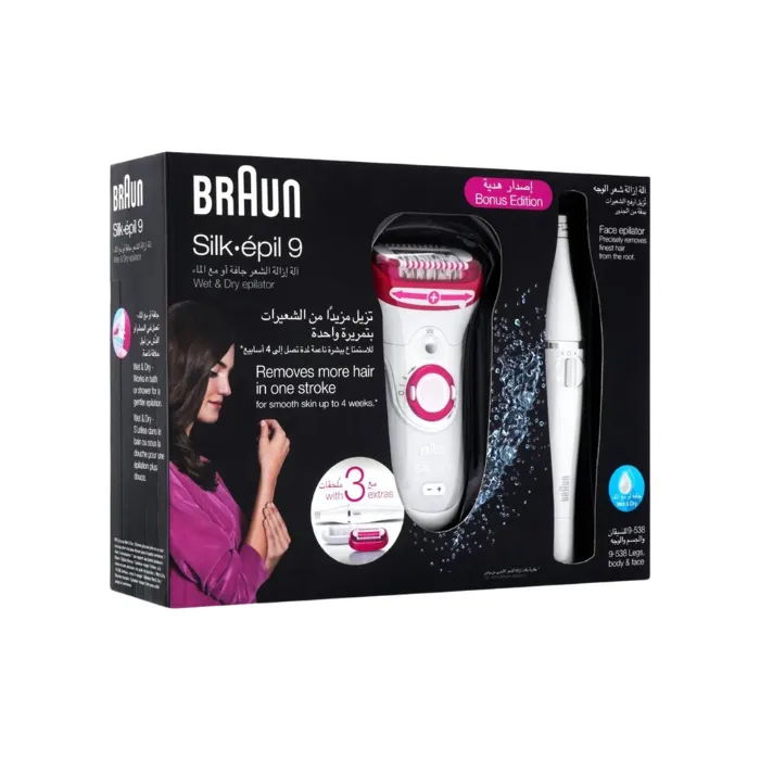 The Braun Silk-épil 9 Wet & Dry 9538 is designed for fast and long-lasting hair removal. It helps you achieve smooth skin for up to four weeks with less effort. Moreover, its advanced design makes epilation more comfortable and efficient.