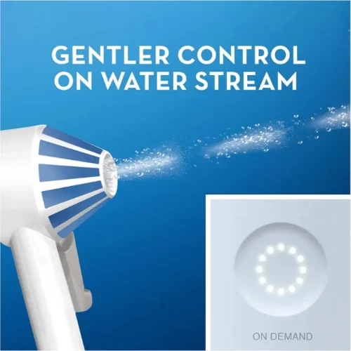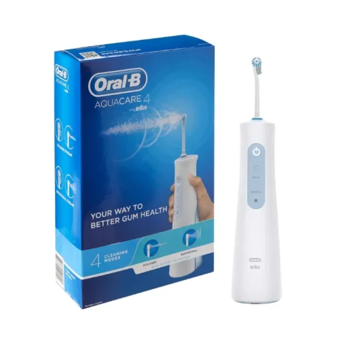The Oral-B Aquacare Water Flosser 4 is designed to improve gum health and remove food trapped between teeth, especially for those with braces or dental work. It uses Oxyjet Technology to enrich water with microfine air bubbles, enhancing your daily oral care routine. The on-demand button gives you precise control over the water stream.