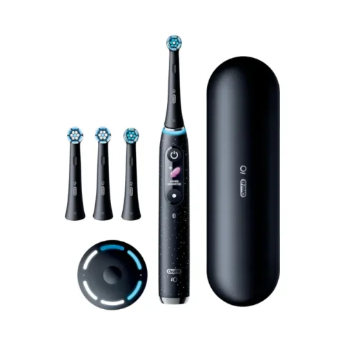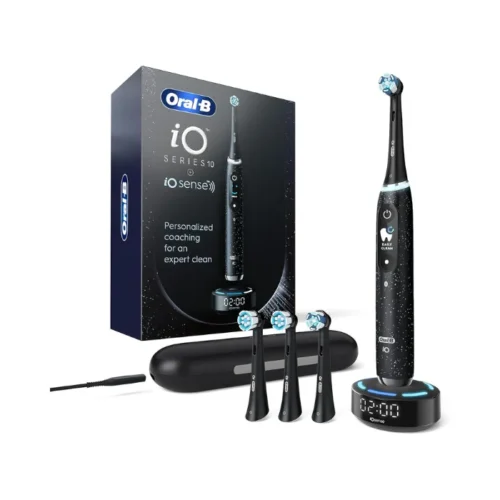 The Oral-B Power iO Series 10 Electric Toothbrush delivers advanced oral care with intelligent technology designed for adults. Featuring a smart pressure sensor, micro-vibrating bristles, and an interactive color display, it provides a professional clean feeling while protecting gums. The iO Sense smart charger offers real-time live coaching to ensure complete coverage across all six brushing zones.