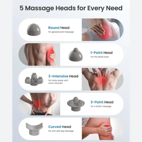 Comes with 5 detachable head attachments so you can customize your massage experience depending on preference and targeted muscle groups.