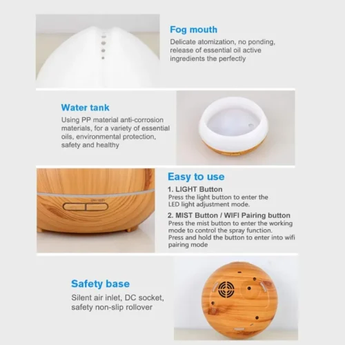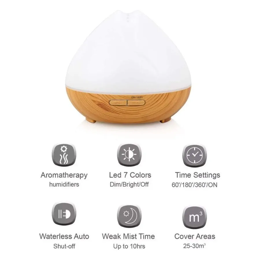 The diffuser includes a 300ml tank capacity. It can run for several hours continuously depending on mist mode. This makes it suitable for bedrooms, offices, and small living spaces.
