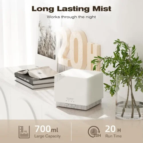 This diffuser features a large, easy-to-clean 700 ml (23.67 oz) water tank, 7 ambient LED light colors, multiple mist diffusion settings, and a built-in safety auto-off switch to prevent overheating when water runs low.