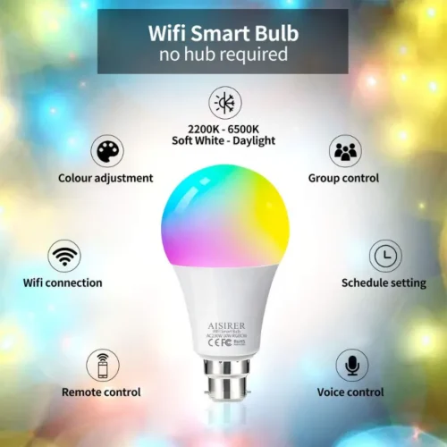 Upgrade your lighting with AISIRER’s B22 smart bulbs. These 10W WiFi-enabled LED bulbs offer vibrant RGB colors and warm white tones, voice control compatibility, and full app integration without requiring a hub.