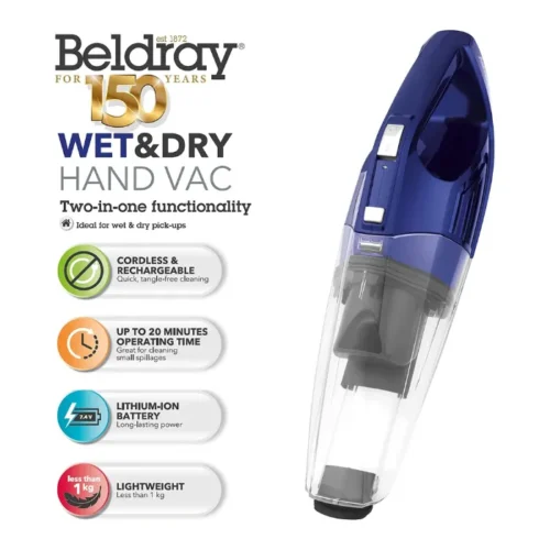 The Beldray BEL0676 Cordless Handheld Vacuum is a versatile 2-in-1 wet and dry cleaner, perfect for home, office, or car use. Its lightweight, portable design and rechargeable lithium-ion battery make cleaning quick and convenient, without the restrictions of cords.