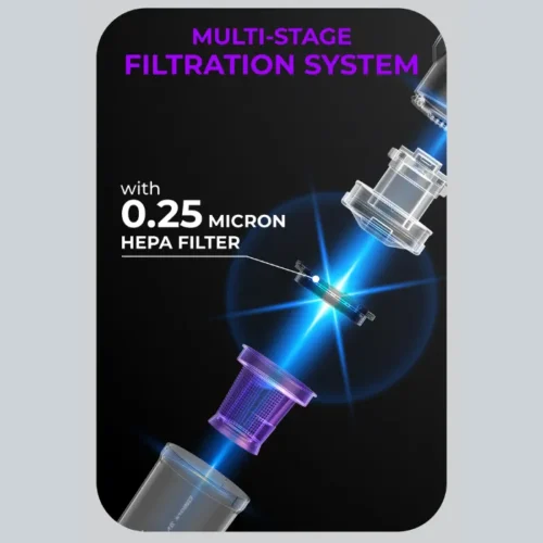 The multi-stage filtration system includes a 0.25 micron HEPA filter. This helps trap fine dust particles and allergens. Consequently, cleaner air is released back into your living space.