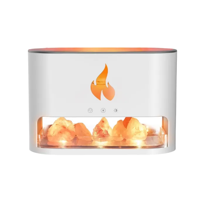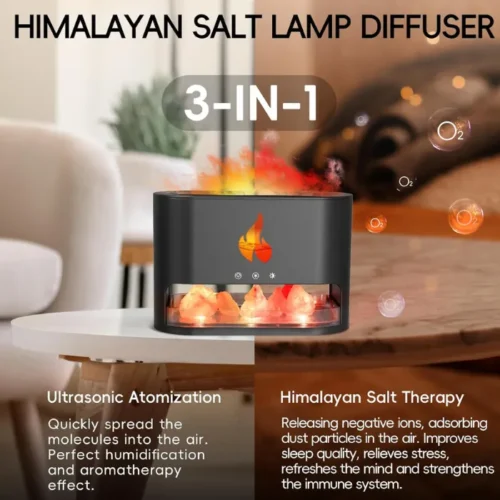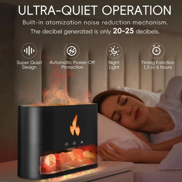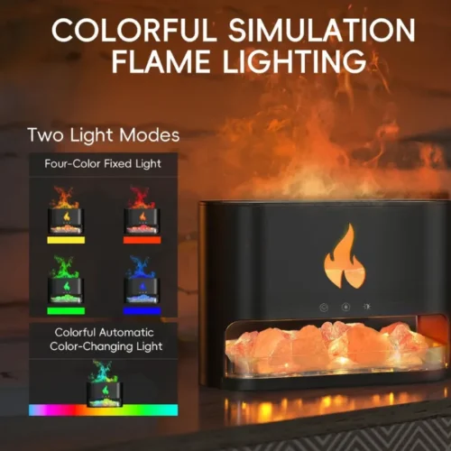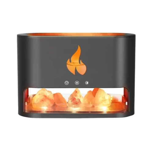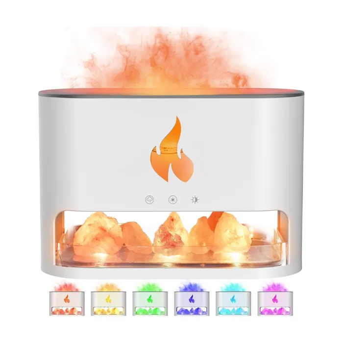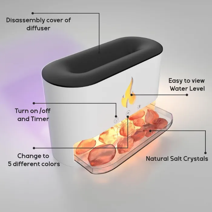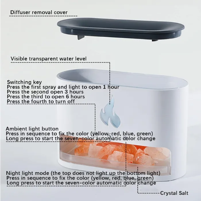 This mist diffuser features three timer modes: 1H/3H/6H. Press the switch for an hour of automatic spray and light. The humidifier safely stops when water runs out. It also includes a box of Himalayan salt rock. These release negative ions, adsorbing dust and improving air quality for easier, healthier breathing.