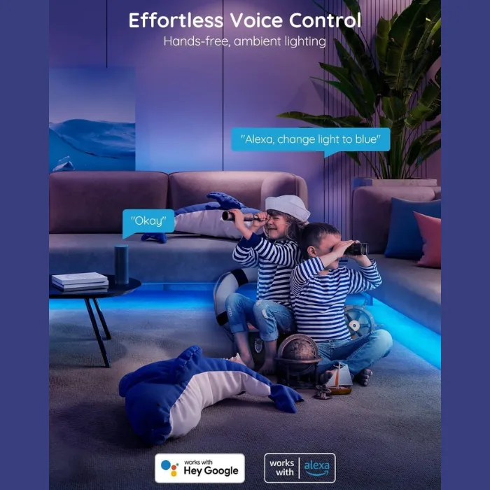 These RGB LED strip lights offer hands-free voice control through Alexa and Google Assistant. You can turn the lights on or off, change colors, or adjust brightness using simple voice commands. With 16 million color options, these lights enhance bedrooms, living spaces and indoor décor.