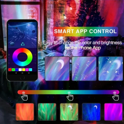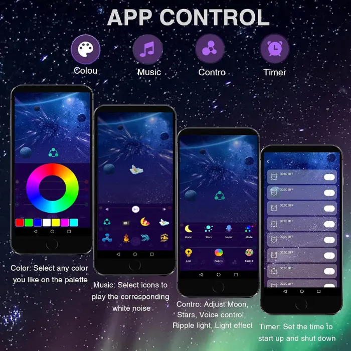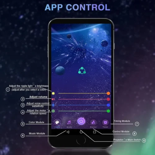 Easily change settings with app control. Adjust projector brightness, music volume, and speed. You can also control the projector by voice, offering ultimate convenience.