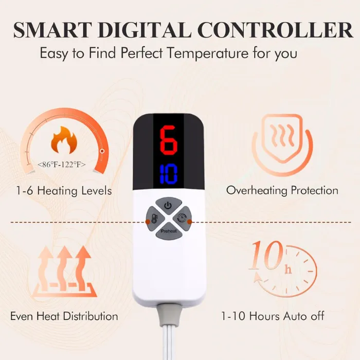 Equipped with a digital controller, the blanket offers 6 fast heating levels (86°F–122°F) and a 1–10 hour timer, allowing you to select your preferred warmth and sleep duration. Enjoy precise comfort and peaceful sleep every night.