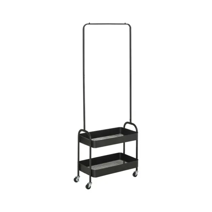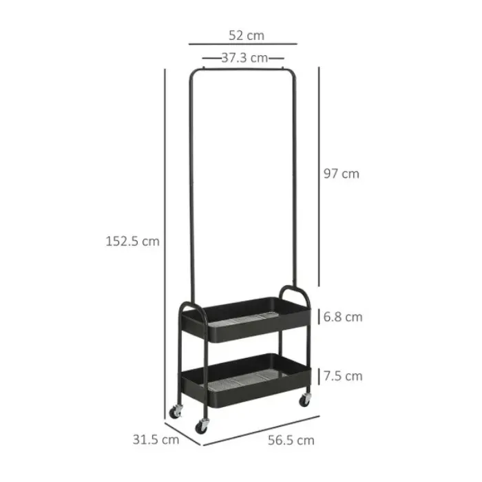 Garment hanging, made mobile with this clothes rack from HOMCOM. The small and compact size of this hanger makes it suitable for smaller chunks of clothing in tighter areas, such as hallways, entrance cupboards, cloakrooms and beyond. The frame, made from power coated metal, is strong and will hold your coats and similar with support. Two trays on the bottom make room for shoes, bags and similar. It’s finished with four wheels to move around easily.