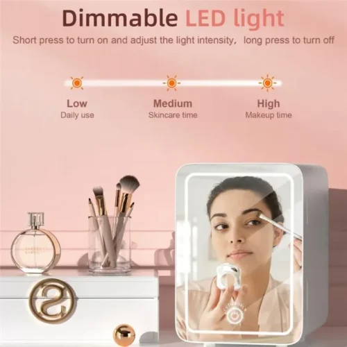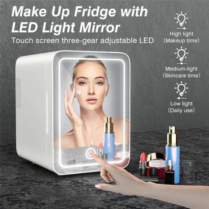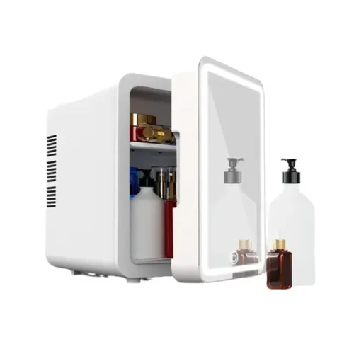 The fridge features an integrated LED mirror, making it convenient for skincare application and makeup touch-ups. The mirror adds both functionality and style, helping streamline your beauty routine.