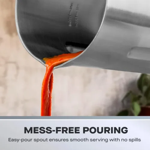 Safety is a priority. An over-fill sensor and dry-burn prevention technology ensure a hassle-free, mess-free cooking process. The stainless steel interior adds durability. An easy-pour spout makes serving simple.