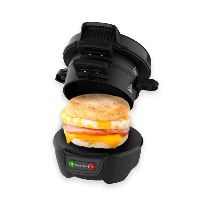 This sandwich maker is incredibly simple to operate. Toast your bread, cook the egg, heat the meat, and melt the cheese—all at the same time! The circular cooking rings ensure perfectly shaped English Breakfast Muffins, ready in under five minutes.
