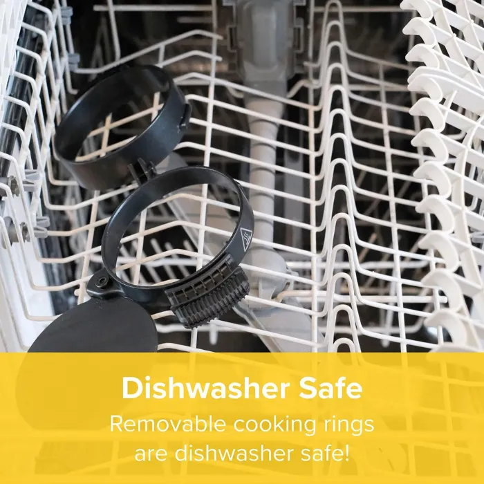 Features removable, non-stick cooking rings that are a breeze to clean. Simply detach, rinse with warm soapy water, wipe, and you’re ready to go again—no food residue left behind.