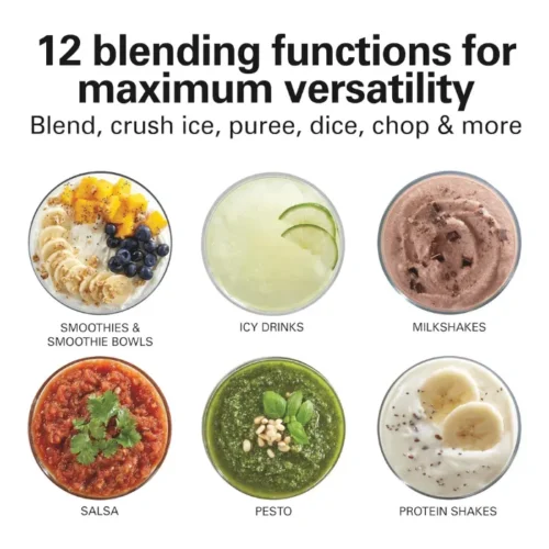 This multi-function kitchen blender offers 12 blending functions. Control them with 5 buttons on an easy-to-read panel. It blends and crushes ice for smoothies and milkshakes. It also purees, dices, chops, and more, providing maximum versatility for your kitchen tasks.