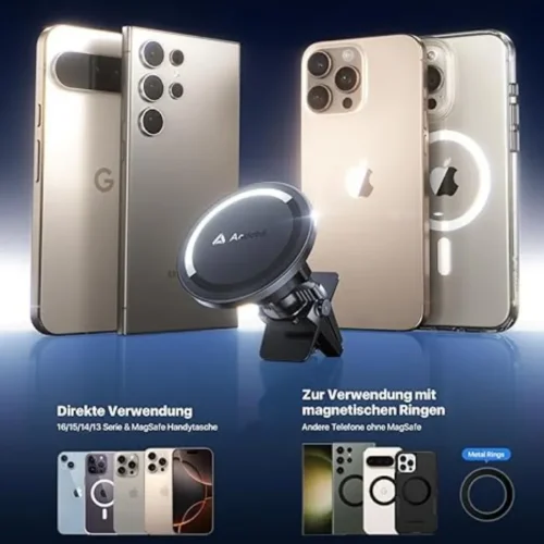 No MagSafe? No problem! Our magnetic car holder is compatible with all smartphones and phone cases. We include two additional metal rings you can easily attach to your phone or case if your device doesn’t have built-in MagSafe functionality. What’s more, the clever hollow ring design of this holder does not block your phone’s wireless charging capability.