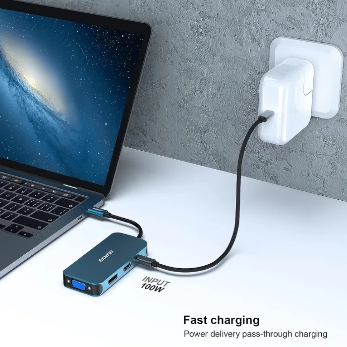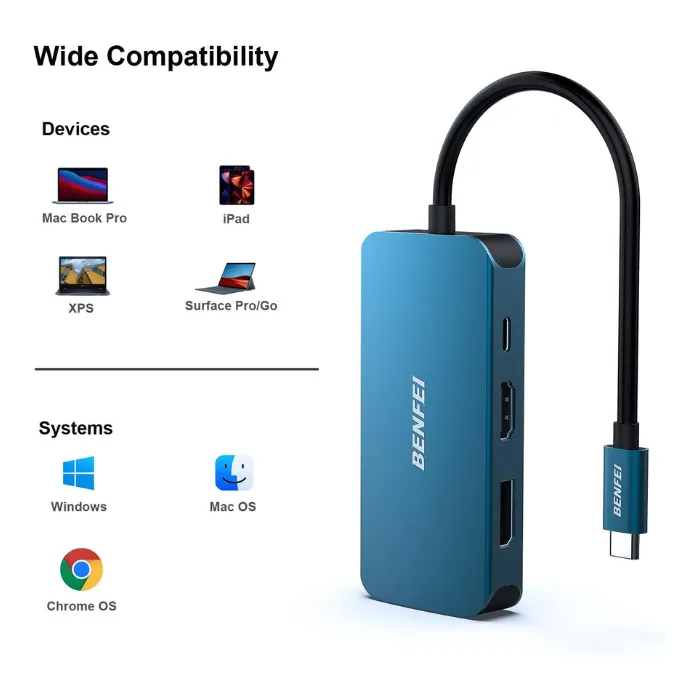 The BENFEI USB Type-C to HDMI + VGA + DisplayPort adapter lets you connect your USB-C or Thunderbolt 3 device to virtually any display. With a lightweight and compact design, it’s perfect for extending your desktop, conducting presentations, or enjoying entertainment on a larger screen.