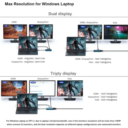 Enjoy stunning visuals with support for up to three simultaneous display outputs, including HDMI (up to 3840×2160@30Hz), DisplayPort (up to 3840×2160@60Hz), and VGA (up to 1080p@60Hz). Whether mirroring or extending, the MST feature lets you customize your screen setup.