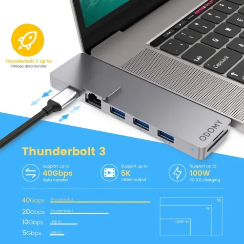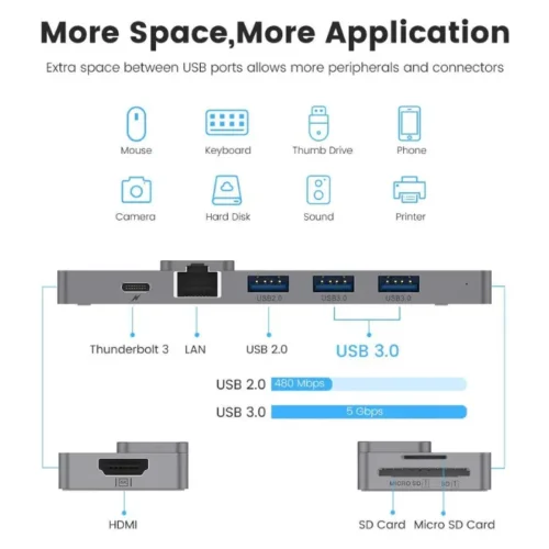 This multifunctional hub features a Thunderbolt 3, 4K HDMI, Gigabit Ethernet, 2 USB 3.0 ports, 1 USB 2.0 port, and dual SD/TF Card Readers, enabling efficient connection to multiple devices. Whether you’re transferring data, projecting a display, or accessing memory cards, everything is covered.