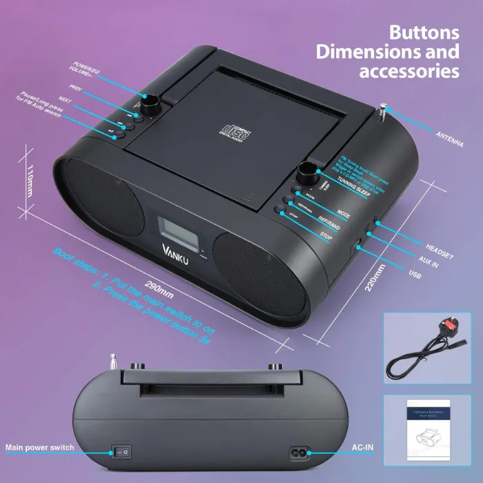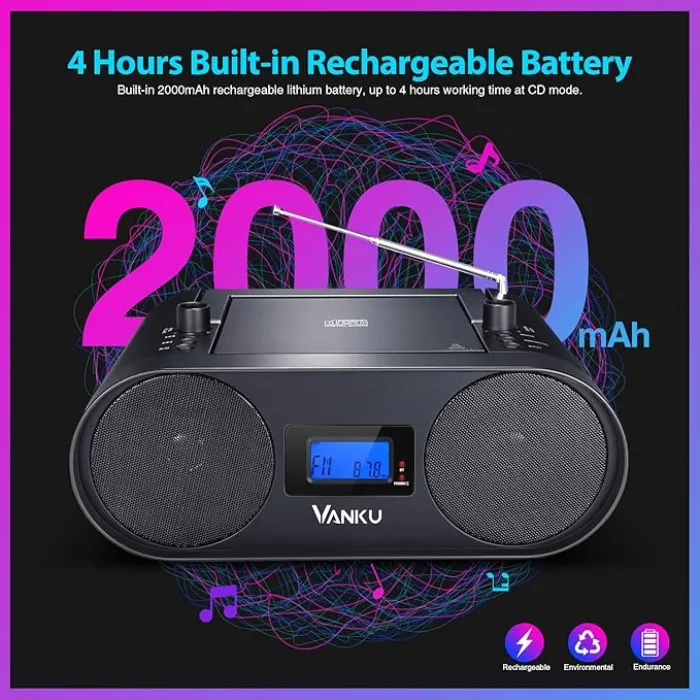 This boombox includes a built-in 2000mAh lithium battery. It’s more convenient and eco-friendly than models needing dry cells. A full charge provides about 4 hours of playtime in CD mode. Other modes run for 6 hours at max volume. Enjoy your music anywhere, no power source needed.