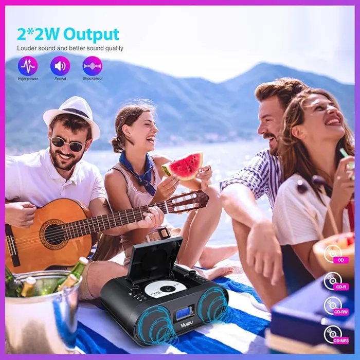 Experience clear and robust audio. Two 2W speakers easily fill your room with sound. Choose from 4 EQ modes: Jazz, Pop, Classic, and Rock. The CD player supports multiple formats, including CD-MP3, CD, CD-R, and CD-RW.