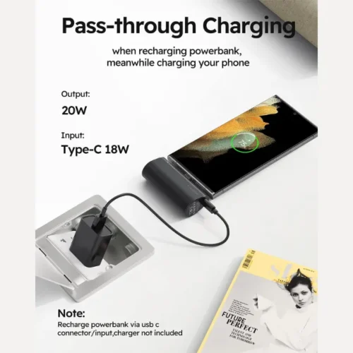 While recharging the power bank itself, you can charge your USB-C devices simultaneously. Ideal for charging phones, Oculus Quest, or other low-wattage USB-C gadgets.