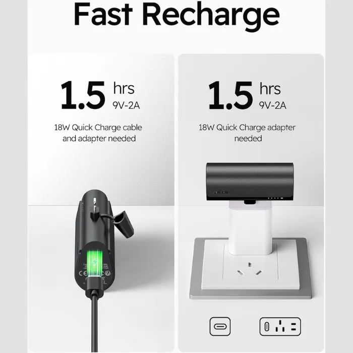 The USB-C input supports QC and PD fast charging protocols, allowing a full recharge in just 1.5 hours (9V/2A). Output also supports PD, QC3.0, FCP, MTK PE, AFC, and more—delivering fast charging to nearly all USB-C Android phones.
