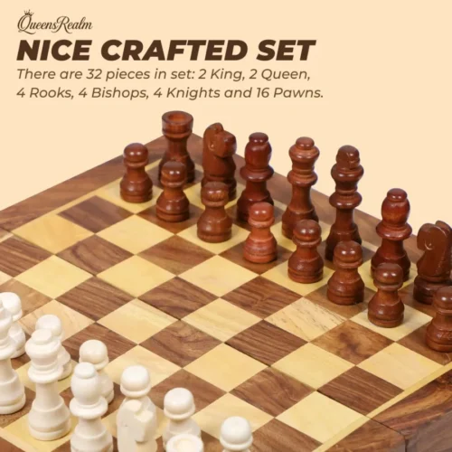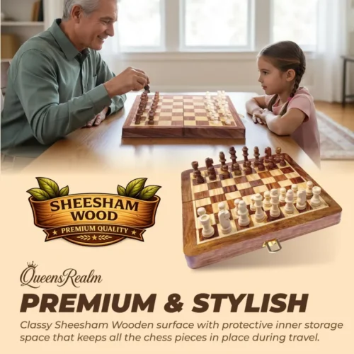 This chessboard is carefully handcrafted from Sheesham wood with a smooth and polished finish. It offers a classic and premium look that plastic boards cannot match. The natural wood texture adds durability and enhances the overall playing experience.