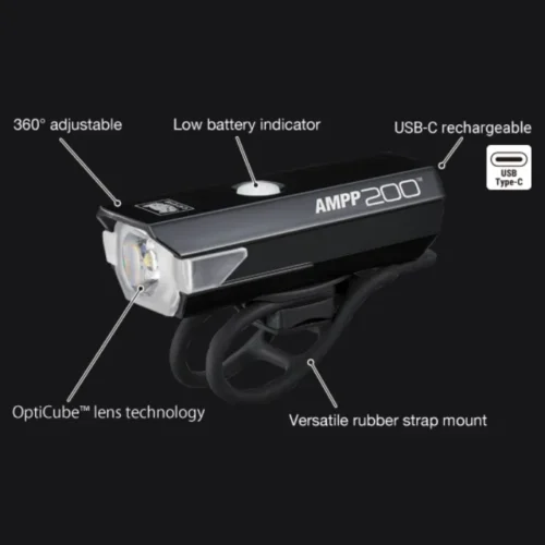 It offers up to 200 lumens of brightness with two light modes, perfect for low-light and night riding.
